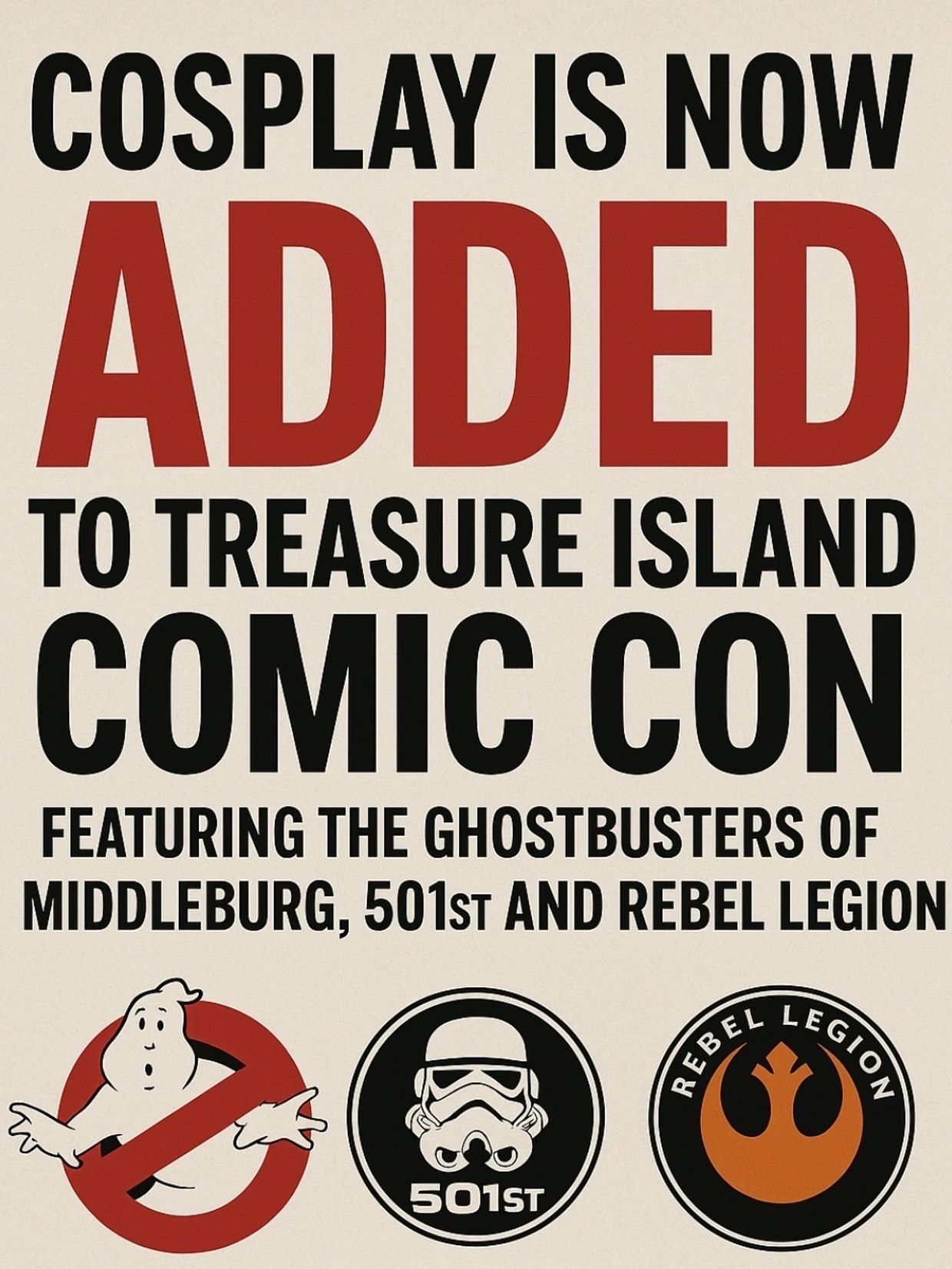 The Treasure Island Comic Con 2025 Festival will feature cosplay from the Rebel Legion, 501st and the Ghostbusters of Middleburg.